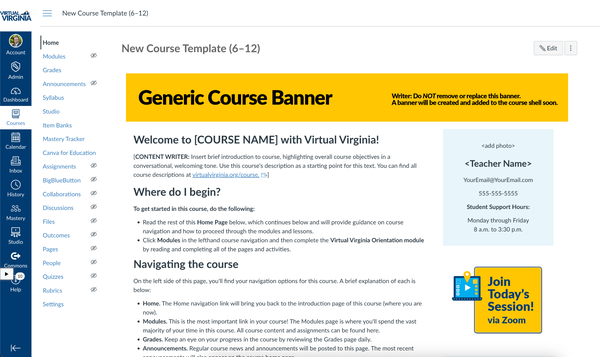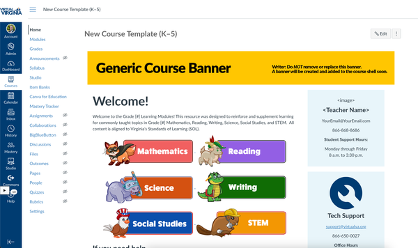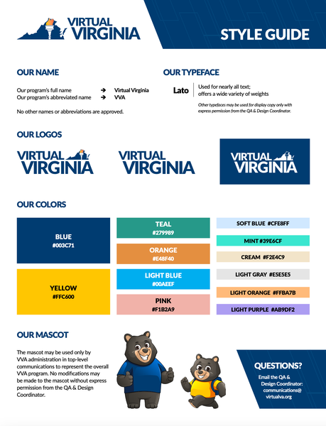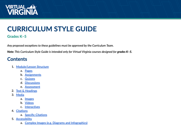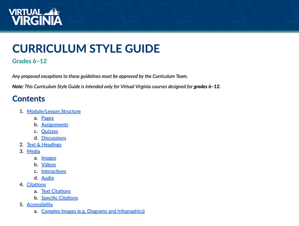 Included here are examples of my instructional design work for Virtual Virginia, including new course templates and curriculum style guides I developed for all VVA curriculum staff and content developers.